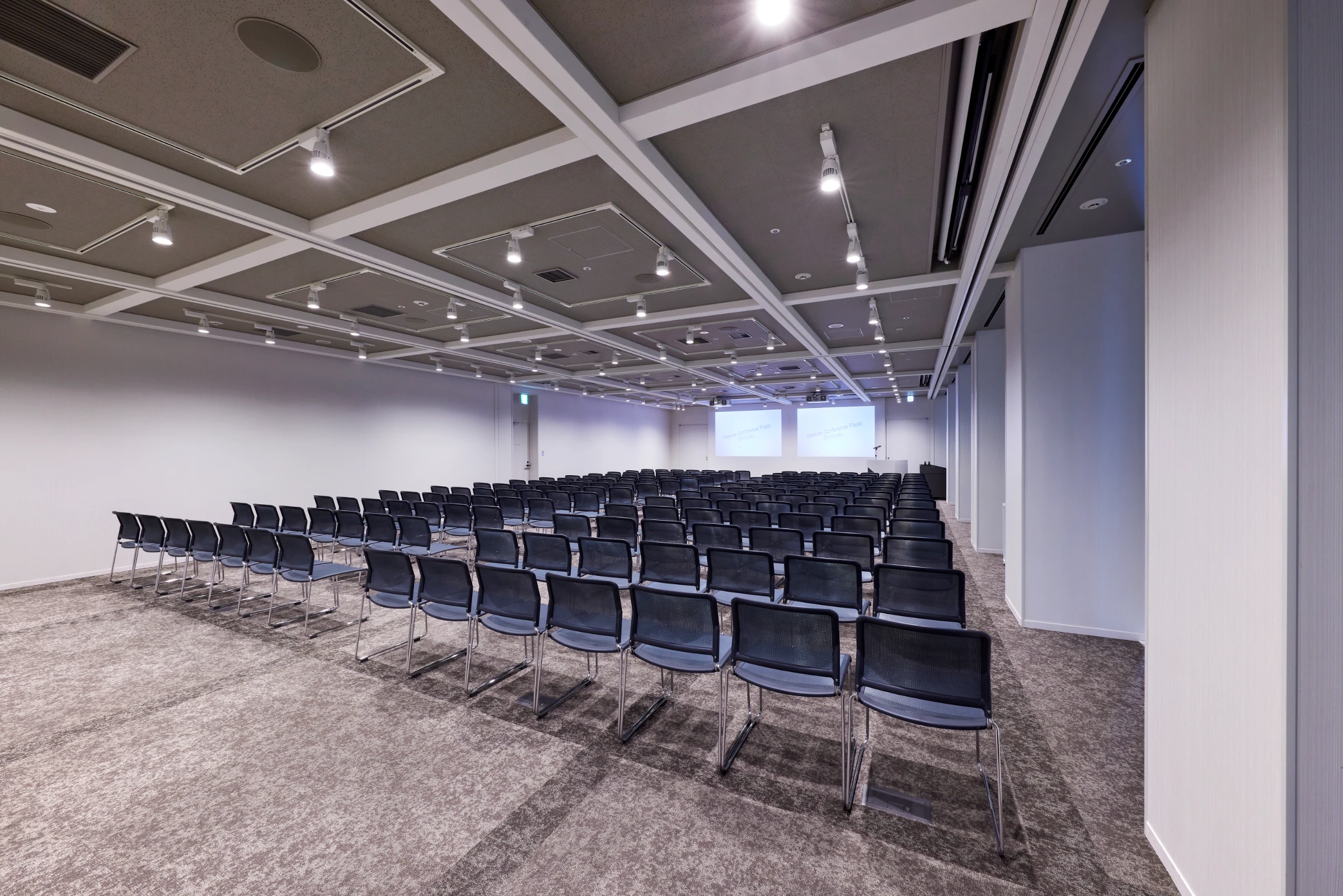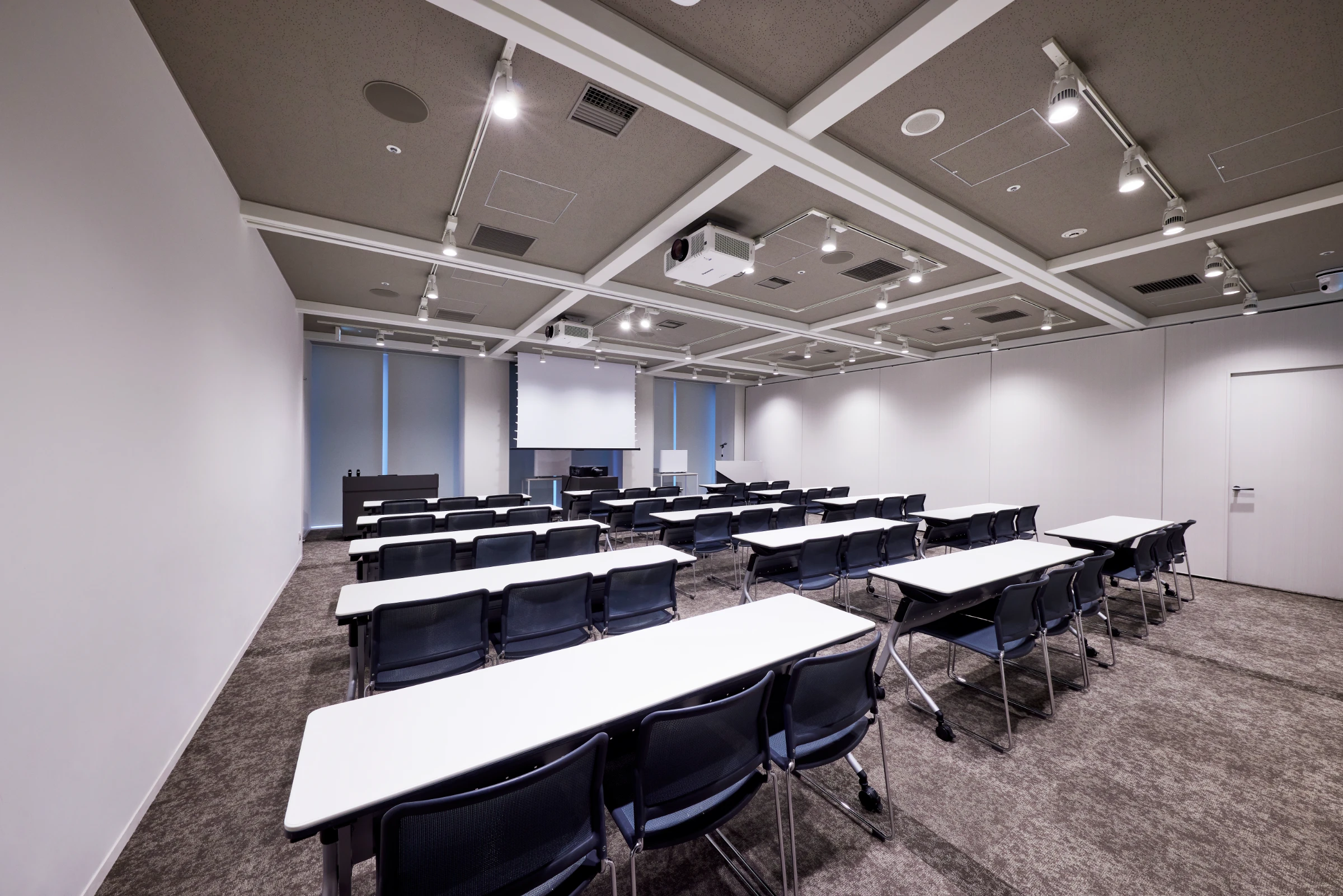 スクール形式で132名までのセミナーや講演会に最適な、本施設最大の広さを誇る会議室です。窓際には電動ロールスクリーンを完備し、採光の調整も自由自在。3mの天井高と大きな窓が開放感を演出します。