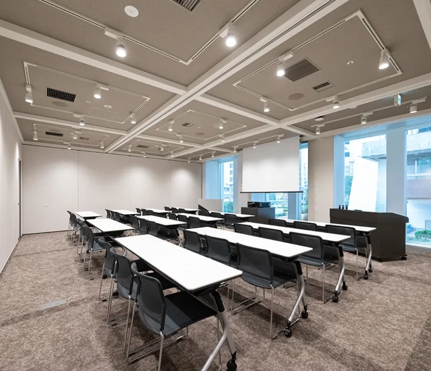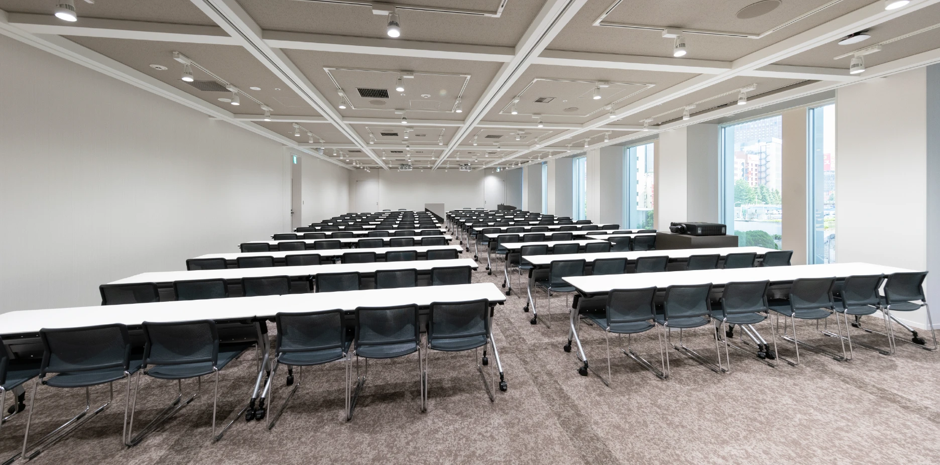 スクール形式で132名までのセミナーや講演会に最適な、本施設最大の広さを誇る会議室です。窓際には電動ロールスクリーンを完備し、採光の調整も自由自在。3mの天井高と大きな窓が開放感を演出します。