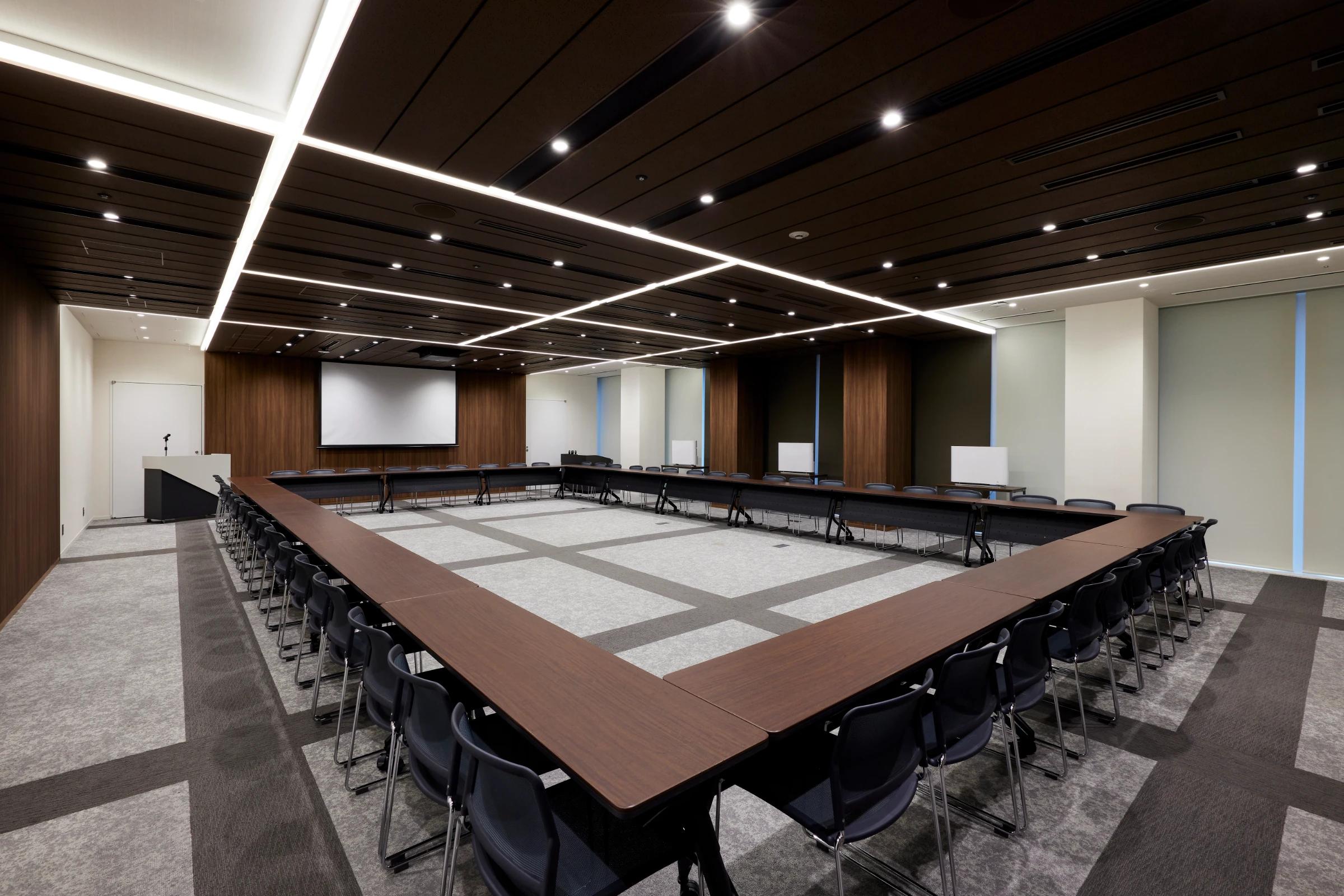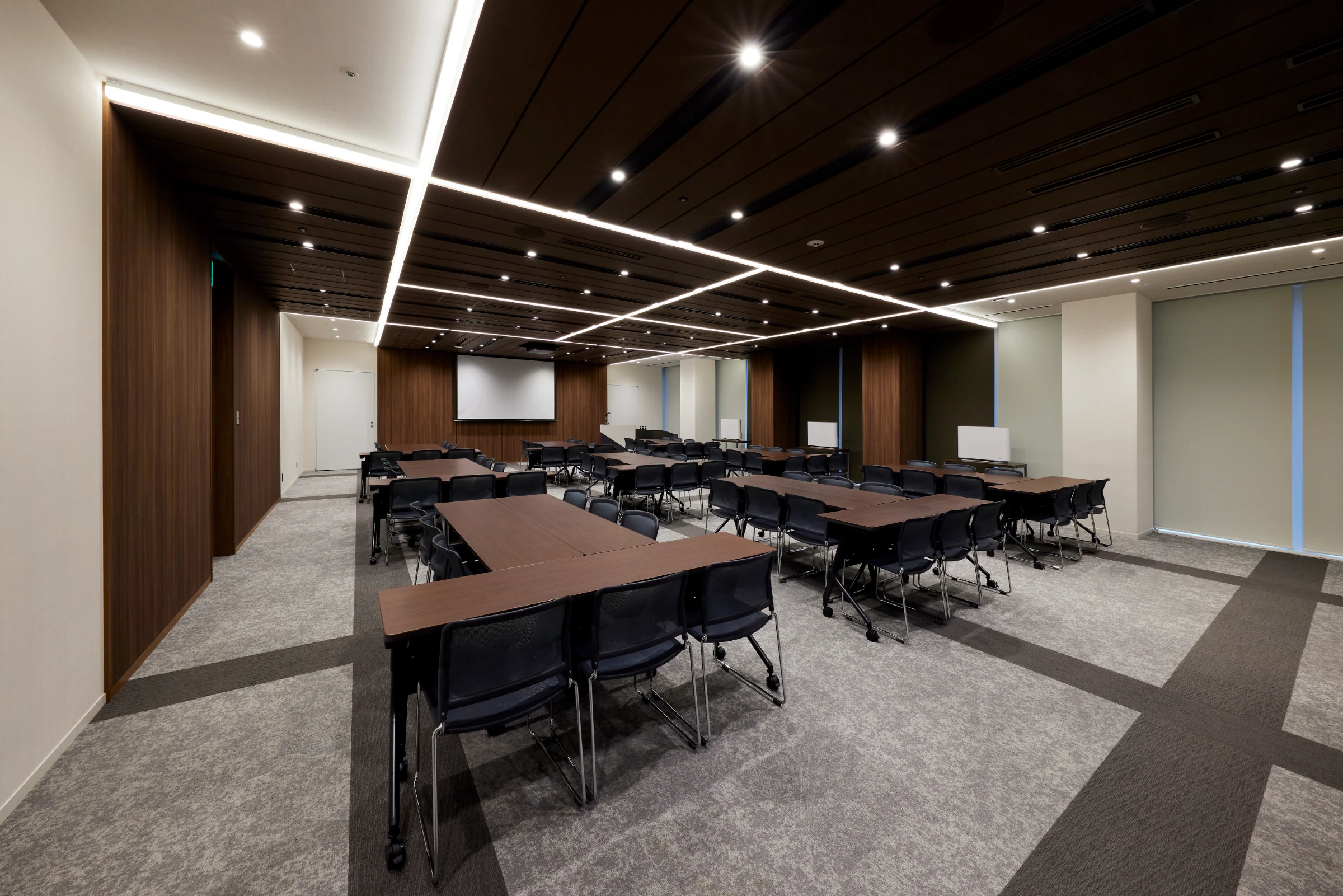 50名から100名規模のセミナーや研修に最適な会議室です。暖かみのある木目調のデザインが、無機質になりがちな会議室とは一線を画す「落ち着き」と「上質感」を演出。