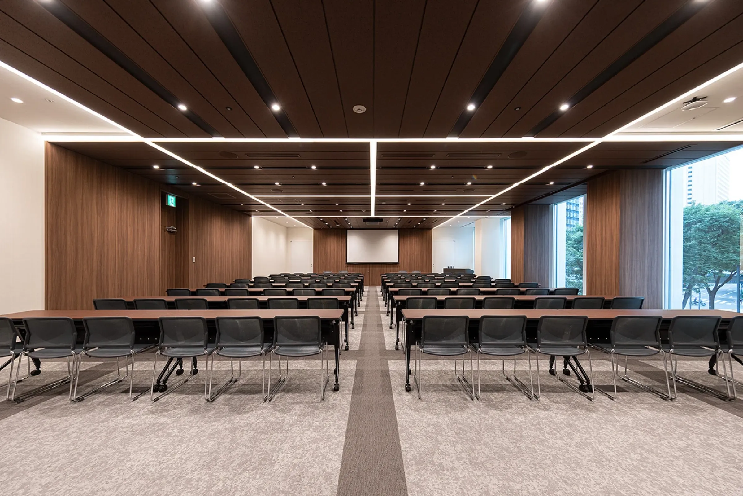 50名から100名規模のセミナーや研修に最適な会議室です。暖かみのある木目調のデザインが、無機質になりがちな会議室とは一線を画す「落ち着き」と「上質感」を演出。